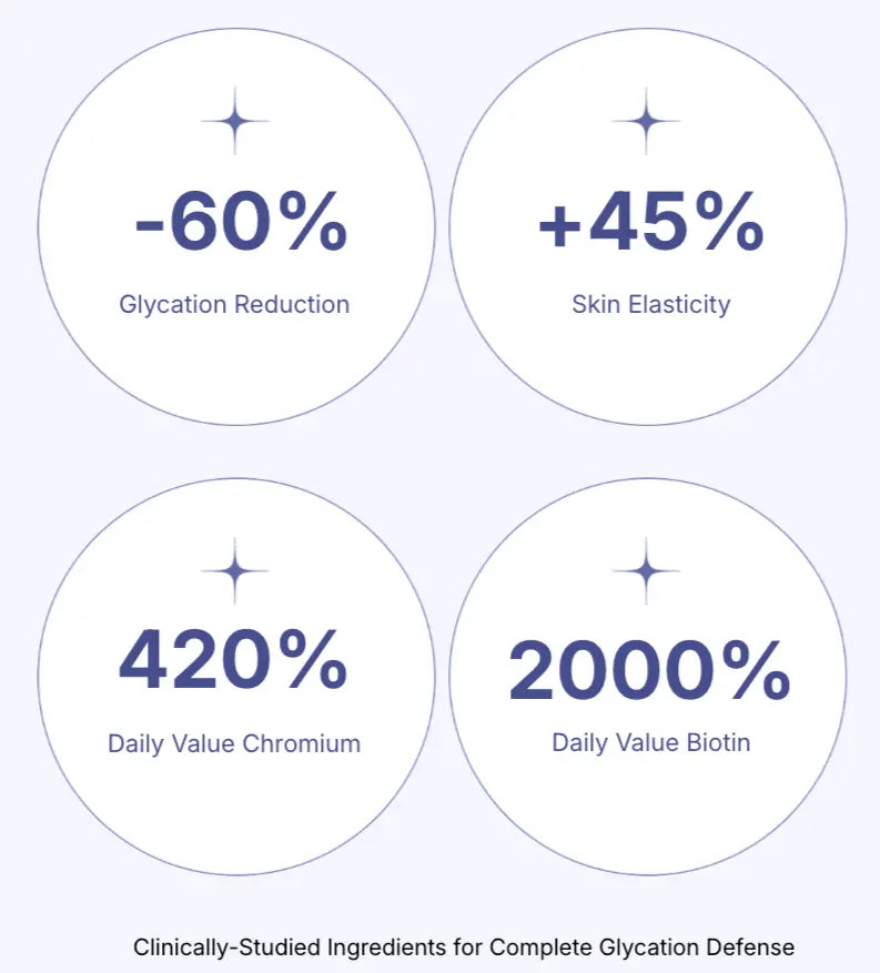 ✓ Blocks Glycation at Multiple Points Alpha Lipoic Acid prevents sugar-protein binding while Chromium, Cinnamon, and Bitter Melon regulate blood sugar at the source—attacking glycation from every angle.